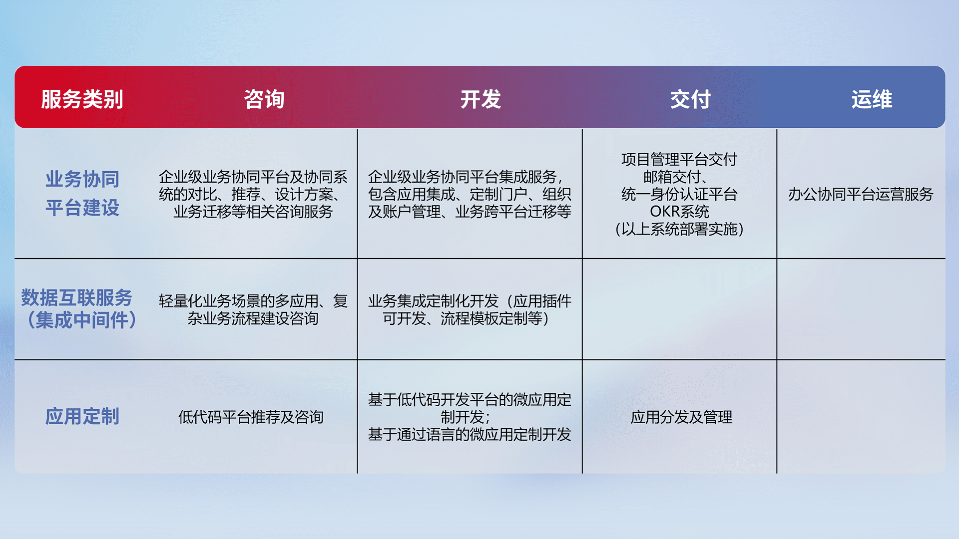 针对钉钉、、、、企微、、、IDaas等平台级产品提供产品的规划、、、、方案、、交付、、、、定制化开发等服务,,,,实现如统一协同办公、、智能客户服务、、、、混合会议管理、、、、智能数据查询、、、、等业务场景,,,实现数字化转型。。。